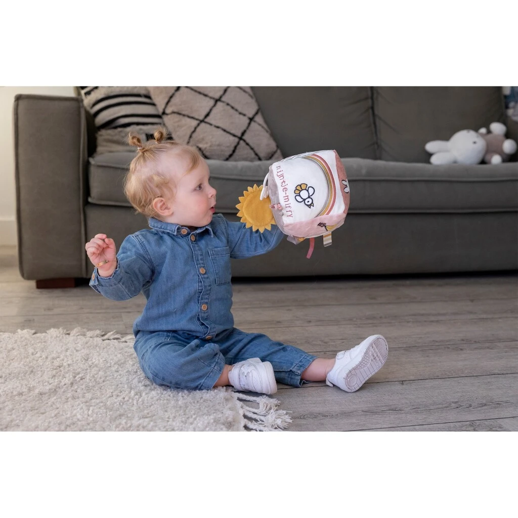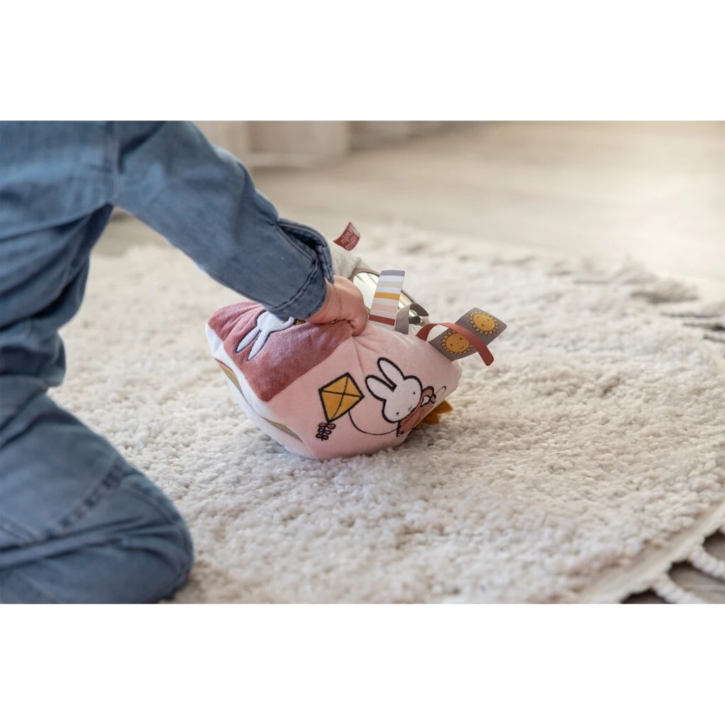 Je kindje zal zich niet snel vervelen met deze leuke activiteitenkubus in roze tinten. Op elke zijde van de kubus is iets anders te ontdekken zoals leuke afbeeldingen, verschillende stoffen, labeltjes om aan te voelen, een spiegeltje en een siliconen Nijntje ring. Ook zit er binnenin de kubus een belletje voor een leuk rammeleffect.