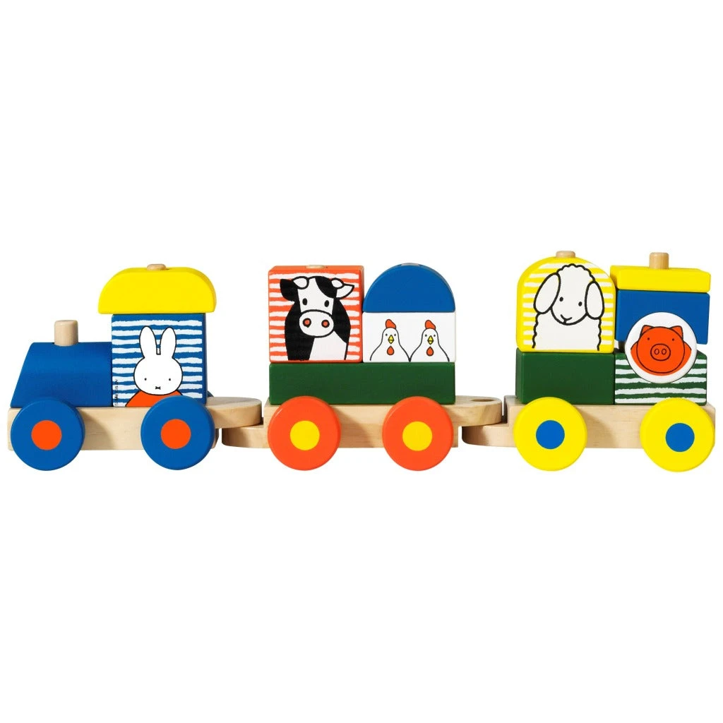 Nijntje rijdt graag in haar treintje en alle dieren mogen natuurlijk mee! Stevige houten trein met gekleurde blokjes die vrij te stapelen zijn op de wagonnetjes. De set bestaat uit 3 wagons en 13 blokjes. Bevorderlijk voor de motoriek, oog-handcoördinatie en het gebruik van de fantasie. Afmeting: 34 x 8 x 10,5 cm. Geschikt voor kinderen vanaf 18 maanden.