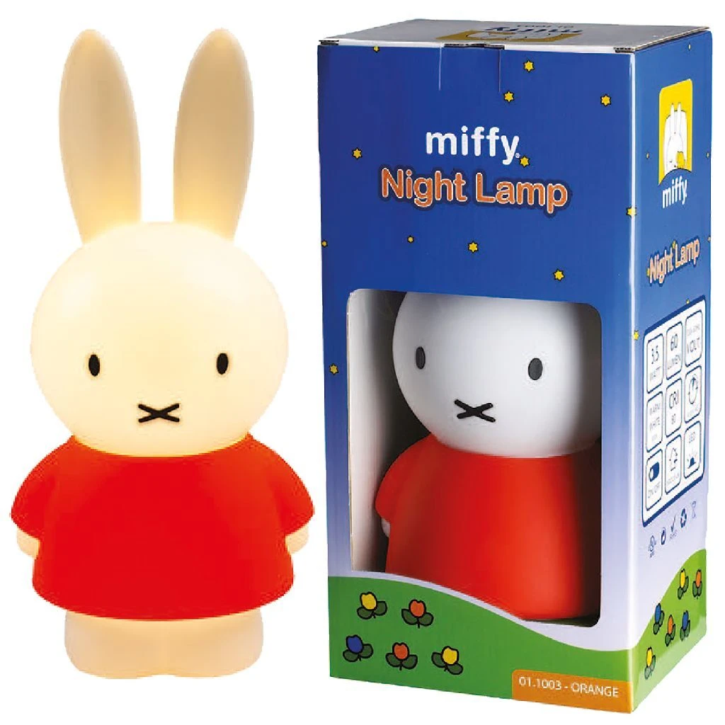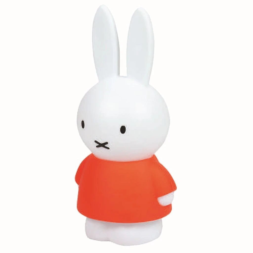 Nijntje lamp: een 30 centimeter hoge staande lamp, in de vorm van het bekende konijntje nijntje. Deze nijntje lamp is uitgevoerd in mat-wit silicone-materiaal en Nijntje heeft een gekleurde jurk aan. Wordt 3 assorti kleuren jurkjes geleverd: rood, geel of blauw. U kunt niet kiezen, maar ontvangt een willekeurige kleur. De lamp heeft een dim-slaap functie en werkt op netstroom. De perfecte lamp om te gebruiken als leeslamp bij het bed!