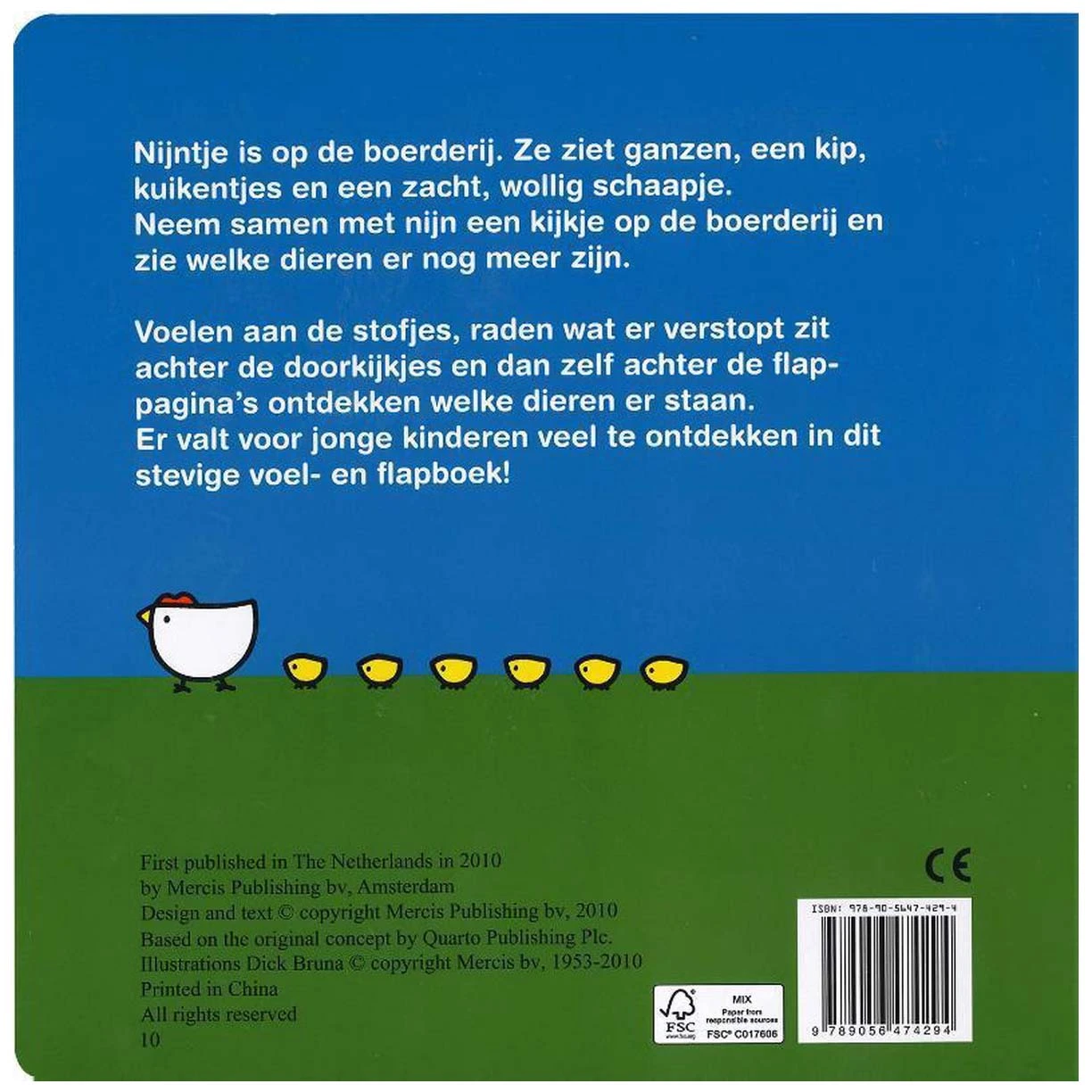 Voel eens wat zacht! Welk dier zou dat zijn, daar achter het hek? Nijntje is op de boerderij en ziet behalve een schaapje ook een koe en een varken. Neem samen met nijn een kijkje op de boerderij. Voel en raad welke dieren er achter de flapjes verstopt zitten.