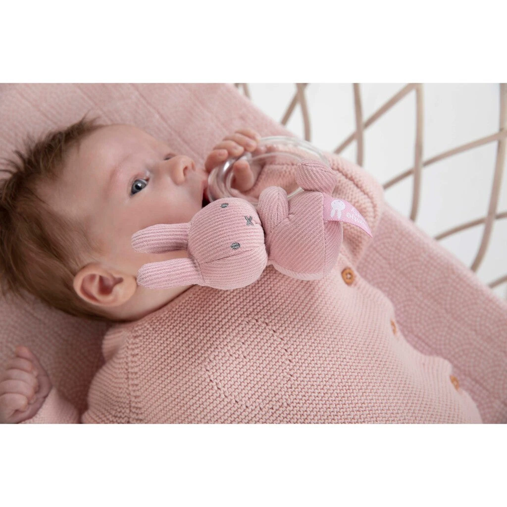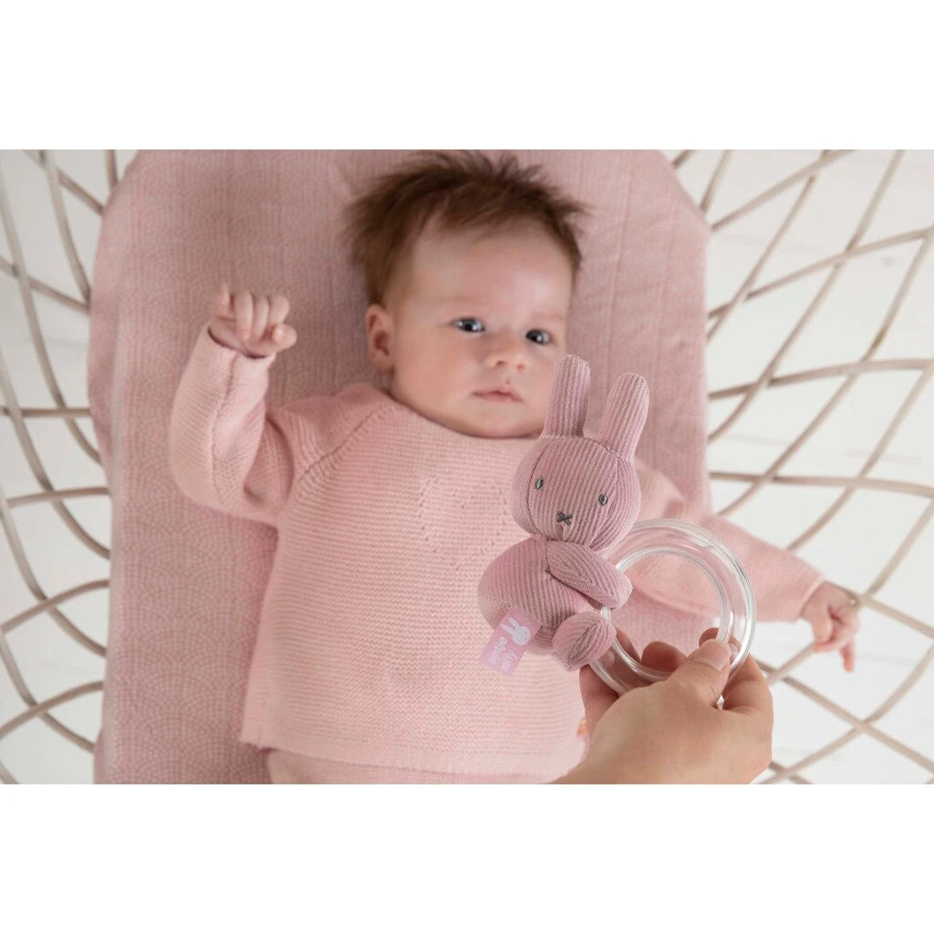 De Nijntje ringrammelaar bestaat uit een roze Nijntje die een doorzichtige bijtring met drie kraaltjes vasthoudt. Wasbaar op 30ºC.Geschikt voor kinderen vanaf de geboorte.