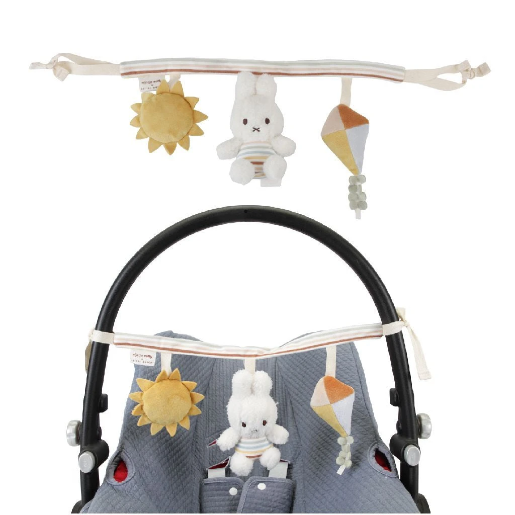 Probeer Nijntje maar te pakken! Deze wagenspanner is niet alleen mooi om naar te kijken als je onderweg bent, hij nodigt ook uit om te spelen. Nijntje en de vlieger en zon uit de Vintage Sunny Stripes-collectie van Little Dutch hebben elk een functie om te ontdekken. Vind het ratelende geluid, het piepen en knisperen! Bevestig de wagenspanner gemakkelijk aan het autostoeltje of de kinderwagen en je kleintje zal zich vermaken als jullie onderweg zijn. Ook goed voor de hand-oogcoördinatie! De wagenspanner is wasbaar in de wasmachine op 30°.